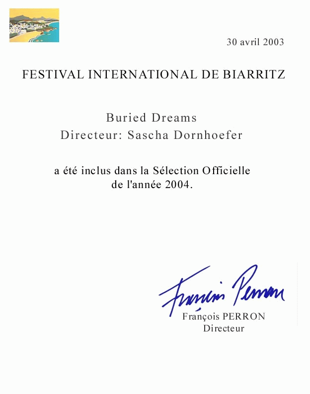 30.04.2004 | "Buried Dreams-Extended Version" beim Festival International de Biarritz, Frankreich. Urkunde | |||||