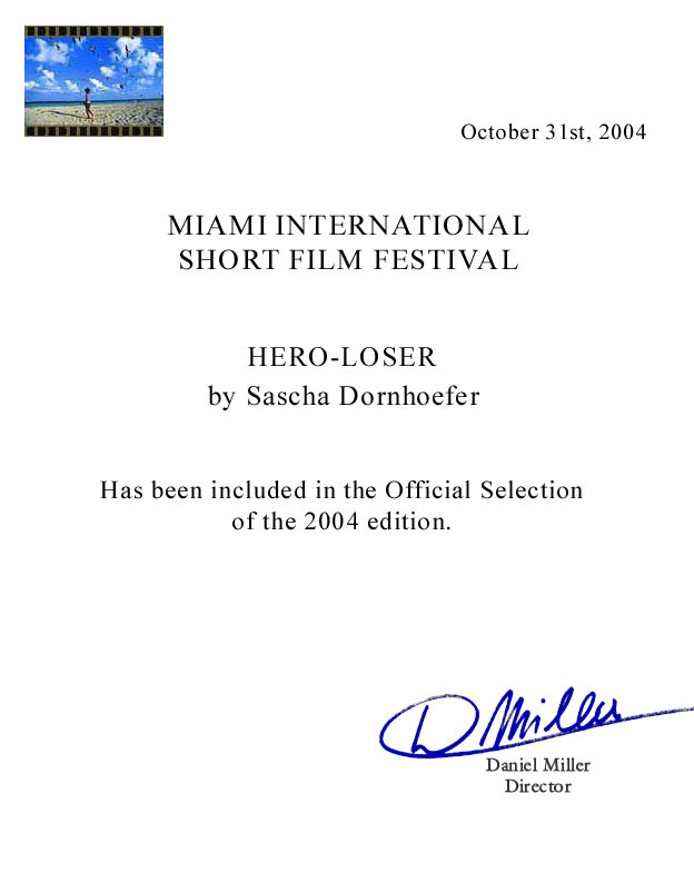 31.10.2004 | "Hero-Loser" beim Miami International Short Film Festival. Urkunde | |||||